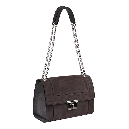 Женская замшевая сумка с яркой фурнитурой и рельефными строчками для важных выходов. Одно основное отделение под клапаном на застежке с поворотным замочком внутри дополнено карманом на молнии. В комплекте идет ремень на цепочках с кожаной вставкой.