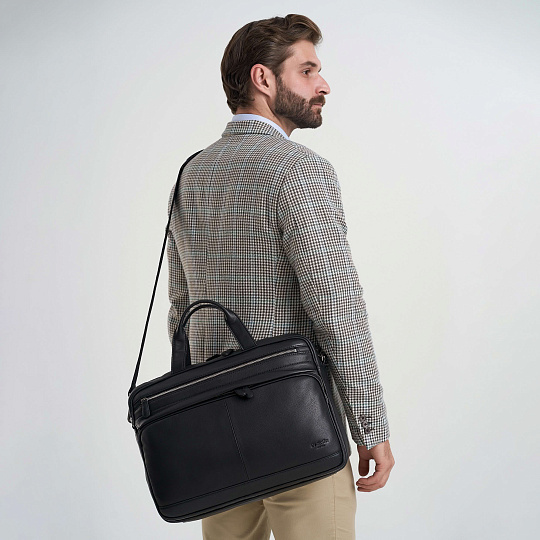 Эта кожаная сумка выполнена в классическом черном цвете, который легко сочетается с любым деловым гардеробом. Она оснащена четырьмя отделениями, что позволяет удобно организовать все необходимые документы и аксессуары. Три дополнительных кармана обеспечивают быстрый доступ к мелочам, которые всегда должны быть под рукой.