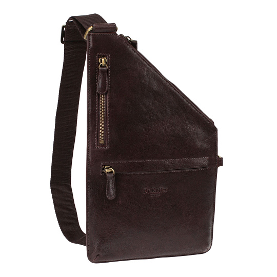 Стильная и необычная сумка через плечо из гладкой кожи. Регулируемый плечевой ремень позволяет носить ее, как замену портмоне или поясной сумки, для этого предусмотрены два крепления карабина ремня. Основное отделение небольшое, но вместительное закрывается на молнию. Несмотря на компактный размер у сумки есть 2 кармана на молнии на лицевой стороне и один наружный карман на молнии на обратной.