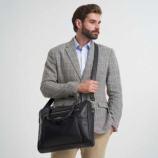 Черный цвет сумки делает её универсальным аксессуаром, который легко сочетается с любым деловым гардеробом. Она станет вашим надежным спутником как на деловых встречах, так и в повседневной жизни, добавляя нотку утонченности в ваш образ.