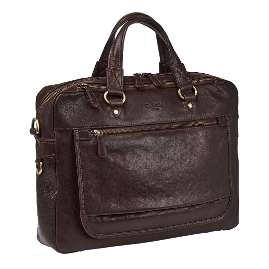 Обаятельная модель, изящно сочетающая свое деловое предназначение с нестандартной симпатичной и современной внешностью. Оригинальный наружный карман с гнездами для визиток и петлями для ручек. Над ним – молния еще одного кармана. Третий наружный карман – на обратной стороне модели. В основном отделении – особая секция со смягченными стенками для ноутбука, она закрывается на липучку, два сетчатых кармана и большой карман на молнии. Снизу сумки – изящные, нестандартной формы упоры. Ручки удобные, приятно похрустывающие кожей.Максимальная длина плечевого ремня 150 см, ремень регулируется по длине.