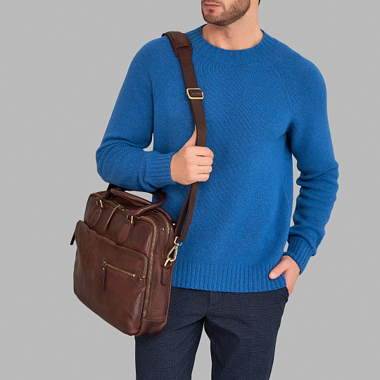 Сумка в винтажном стиле с двумя отделениями, дополнительная секция для ноутбука с мягкой стенкой фиксируется на липучке. Три наружных кармана закрываются на молнии, внутри одного из них расположены четыре открытых кармашка для карточек или пропусков. Удобные плотные ручки, съёмный ремень на карабинах регулируется по длине. Подкладка хлопковая. К сумке прилагается фирменный мешок для хранения. Главный акцент модели – кожа с винтажной окраской. Прочная, на ощупь гладкая и мягкая, сохранившая фактуру, имеющая индивидуальную окраску, она выделана по технологии растительного дубления с обработкой уже полностью отшитого изделия. Аксессуары из такой варёной кожи очень популярны у европейских покупателей, которые любят выбирать крепкие вещи с характером, выразительные, но не бросающиеся в глаза.