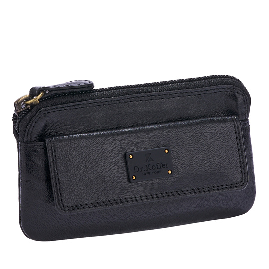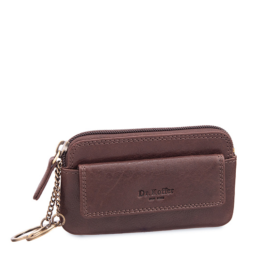 Удобная и практичная современная модель. Вытянутая, горизонтальная форма ключницы предполагает, что в нее легко поместятся ключи даже нестандартного размера. Два кольца для ключей размещены на отдельных металлических ушках. На молнии ключницы – удобный кожаный хвостик-захват. На лицевой стороне модели устроен карман для мелких предметов и “заначек”. Карман закрывается на классическую кнопку. На клапане кармана – клипса с логотипом Dr. Koffer. Ключница сшита из роскошной мягкой кожи и продается в стильной подарочной коробке.