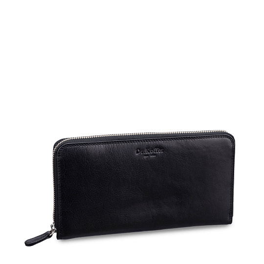 Гранд-портмоне. Фактически его можно использовать как сумку-визитку. Крепление съемной ручки-петельки оформлено незаметно, в виде кольца на сгибе. У модели 4 отделения, посередине расположен карман-перегородка на молнии. Помимо этого у стенок устроены два больших открытых кармана. На обеих внутренних сторонах расположены кожаные блоки для карточек.