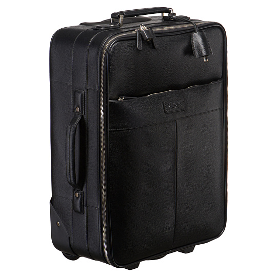Респектабельный двухколесный дорожный аксессуар из натуральной кожи. «Кабин сайз», то есть допускаемый в салон самолета. В лицевом наружном кармане устроен бизнес-блок с кармашками для телефона, визиток, петлями для ручек. В крышке основного отделения три удобных кармана: пропоролоненный на липучке, глубокий карман на молнии и отстегивающийся пластиковый «конверт». В глубоком основном отделении карман на молнии. У модели три ручки – две на корпусе, одна выдвижная. Под выдвижной расположен чехольчик для планшетки с данными владельца.