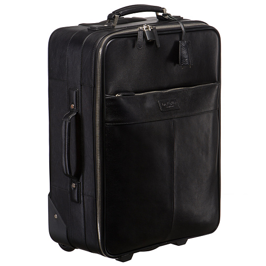 Респектабельный двухколесный дорожный аксессуар из натуральной кожи. «Кабин сайз», то есть допускаемый в салон самолета. В лицевом наружном кармане устроен бизнес-блок с кармашками для телефона, визиток, петлями для ручек. В крышке основного отделения три удобных кармана: пропоролоненный на липучке, глубокий карман на молнии и отстегивающийся пластиковый «конверт». В глубоком основном отделении карман на молнии. У модели три ручки – две на корпусе, одна выдвижная. Под выдвижной расположен чехольчик для планшетки с данными владельца.