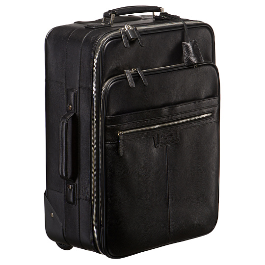 Глубокий чемодан cabin size. Сшит из натуральный кожи и смотрится очень респектабельно. Каскад из трех наружных карманов позволяет удобно распределить то, что нужно держать под рукой. Внутри самого большого кармана устроены гнезда для визиток, смартфона, телефона и большой сетчатый карман. В крышке основного отделения карман на молнии и пропоролоненный карман на липучке, в самом отделении – карман на молнии. У модели две ручки на корпусе и выдвижная. На обратной стороне вшит чехол для планшетика с данными владельца.