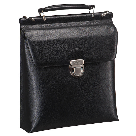 Подчеркнуто респектабельная модель: внутренняя сторона клапана выполнена из замши в цвет основной кожи, торцы саквояжной планки оформлены кожей, видимый участок внутренней стенки основного отделения до кармана на молнии отделан кожей. Фурнитура сатинированная, строчка аккуратная. Внутри планшета гнезда для телефона, карточек, петли для ручек-карандашей и карман на молнии. Наружный карман на обратной стороне также закрывается на молнию. Съемный плечевой ремень прилагается.