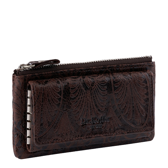 Модель с двумя вариантами крепления ключей: европейским – на застежках, и российским – на кольце. Европейский вариант вынесен в отдельный блок, в отворотах которого устроены еще и потайные кармашки. Кольцо с цепочкой расположено в основном отделении и допускает размещение увесистой связки. На обратной стороне ключницы прорезной карман для нестандартного ключа или ключей, которые требуется держать отдельно от остальных. Обратите внимание, в пару к этой модели можно приобрести другие аксессуары, выполненные в таком же дизайне.